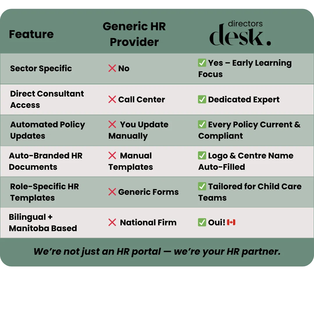Join hundreds of child care leaders across Manitoba who already trust Curbridge for HR peace of mind, and can't wait to access Directors Desk. We want you to experience what it’s like to have expert guidance at your fingertips.